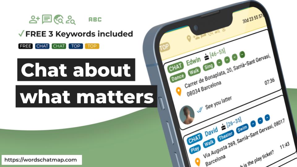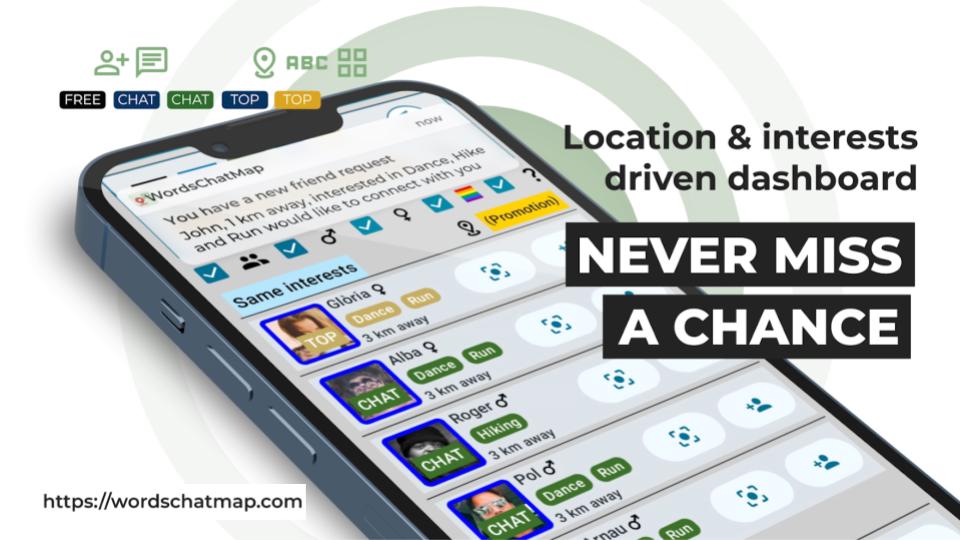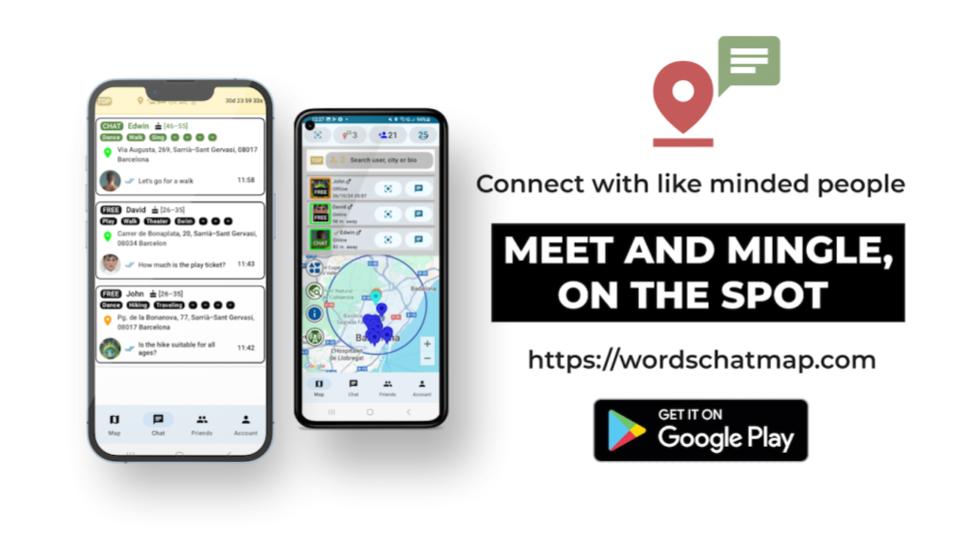 Find people close to you, either by hobbies or geographical location, send a connection request, chat and meet in person. With Wordschatmap you have new friends at your fingertips.